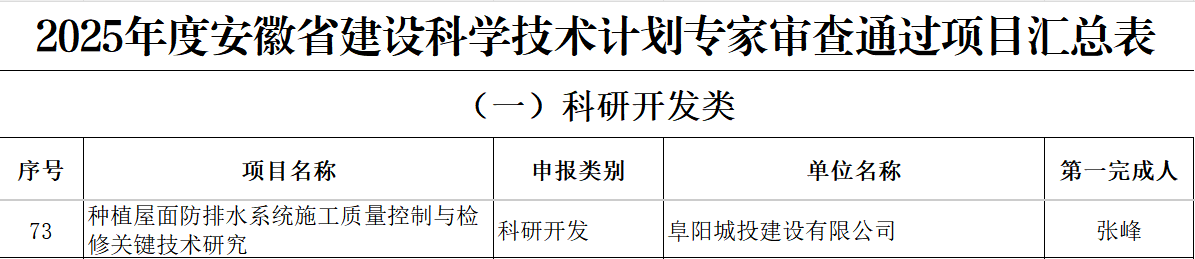 近日,安徽省住房和城鄉(xiāng)建設(shè)廳公示了2025年度安徽省住房和城鄉(xiāng)建設(shè)科學(xué)技術(shù)計(jì)劃項(xiàng)目名單,城建公司牽頭承擔(dān)的種植屋面防排水系統(tǒng)施工質(zhì)量控制與檢修關(guān)鍵技術(shù)研究成功入選。